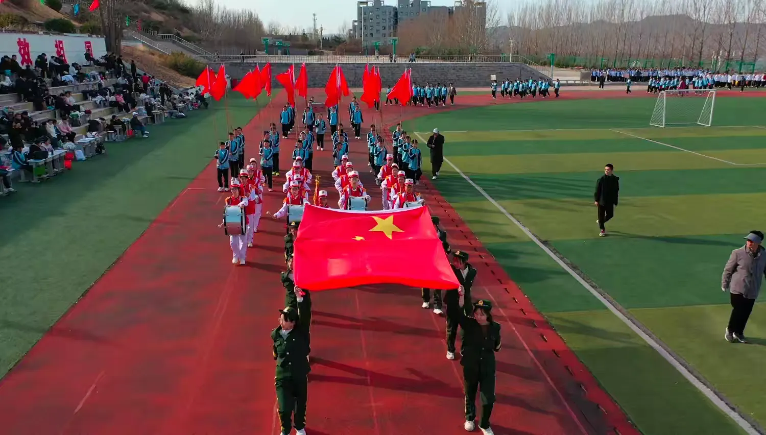首先映入眼帘的是国旗方队、鼓号队和彩旗方队,他们迈着矫健有力的步伐,精神抖擞地步入会场,拉开了这场视觉与精神盛宴的序幕。
